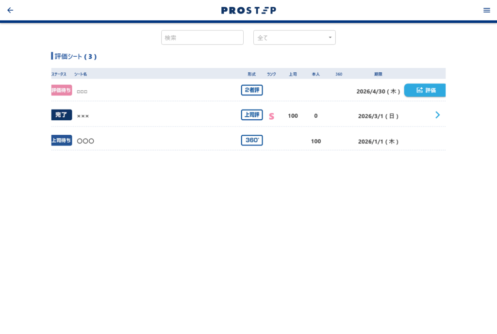 ログインすると、評価シート一覧が表示されます。